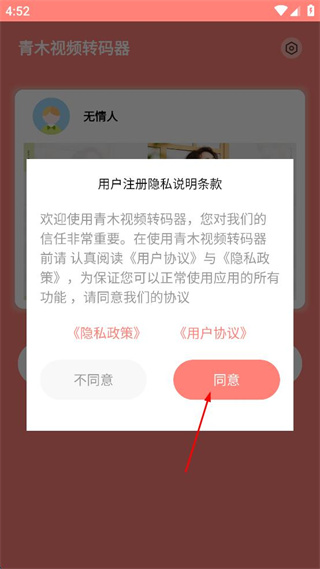 1、打开青木视频转码器,查看弹出的用户注册隐私说明条款,点击同意按钮进入主界面。