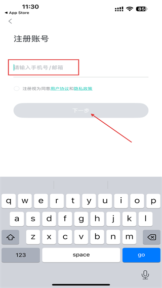 2、在注册账号页面,输入手机号或邮箱,点击下一步的按钮。