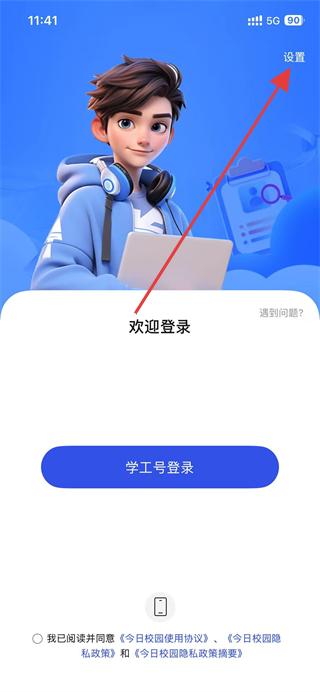 1、打开今日校园APP,点击登录页面右上角的设置。