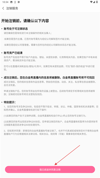 5、阅读页面中的注销确认内容后,点击我已阅读并同意注销按钮。