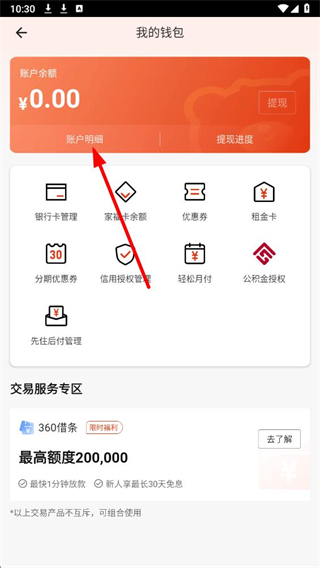3、在我的钱包页面,点击账户明细选项,进入账户明细页面。