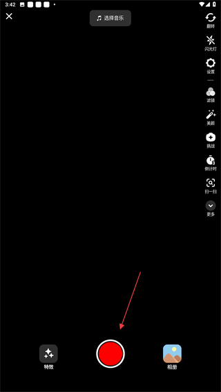 2、在拍摄页面选择音乐后,再点击底部红色拍摄按钮,开始录制视频。