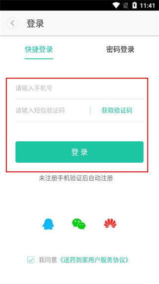 3、输入手机号、获取并填写短信验证码,点击登录,自动完成注册。