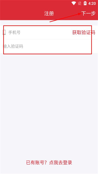 3、在注册页面填写手机号,输入收到的验证码后,点击下一步完成后续注册流程。