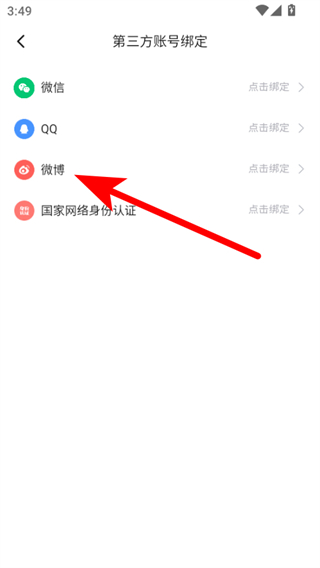 5、在第三方账号绑定页面,选择微博选项并点击点击绑定,按提示完成微博账号的授权绑定操作。
