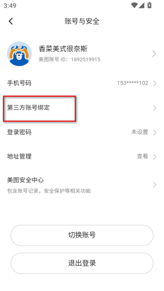 4、在账号与安全页面,点击第三方账号绑定选项,进入第三方账号绑定页面。