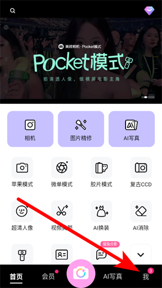 1、打开美颜相机APP,点击右下角我,进入个人页面。