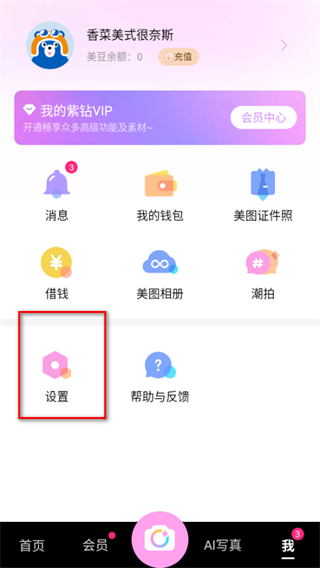 1、打开美颜相机APP,进入个人页面后点击设置,进入设置页面。