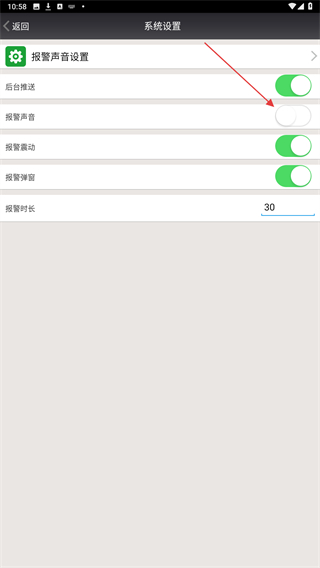 3、进入该页面内,找到报警声音并点击右侧的按钮。