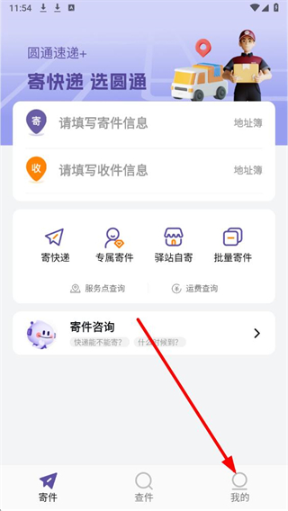 1、在圆通速递主界面,点击底部我的,进入我的个人页面。