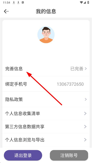 3、在我的信息页面,选择完善信息选项,进入个人资料编辑页。
