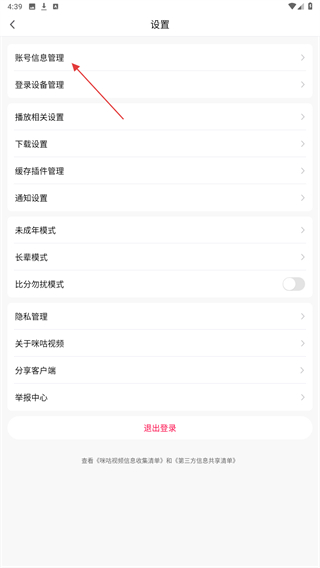 3、在设置页面中,找到并点击账号信息管理选项,进入账号信息管理页面。