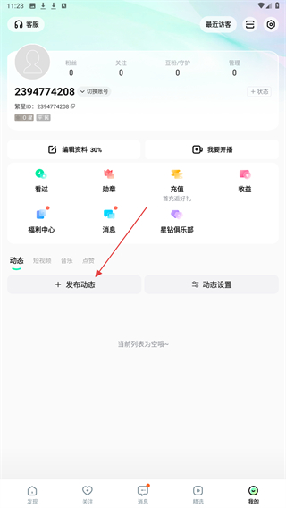 2、在个人中心的页面内,点击下方发布动态的按钮。