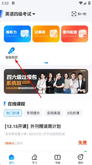 1、打开星火英语APP,在首页点击智能刷题按钮。