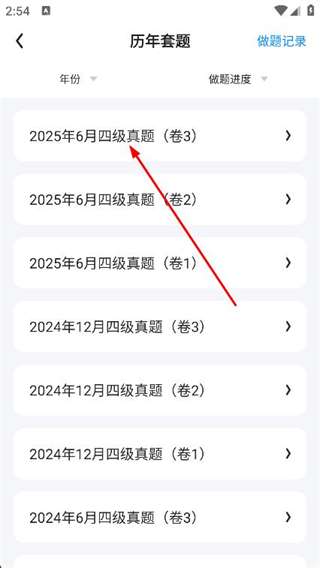 3、在历年套题列表中选择目标真题,点击进入。