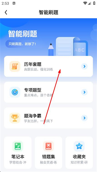 2、在智能刷题页面,找到并点击历年套题选项。