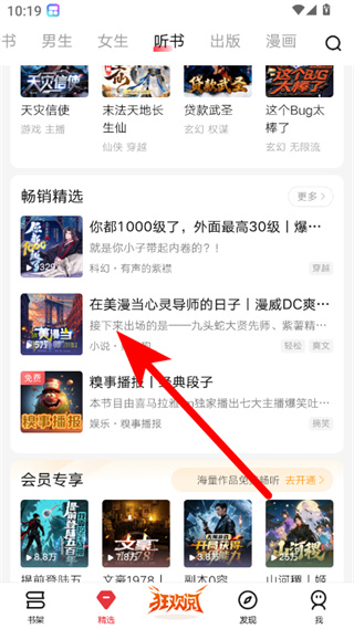 1、在起点读书精选页面,点击上方听书选项,进入听书专区。