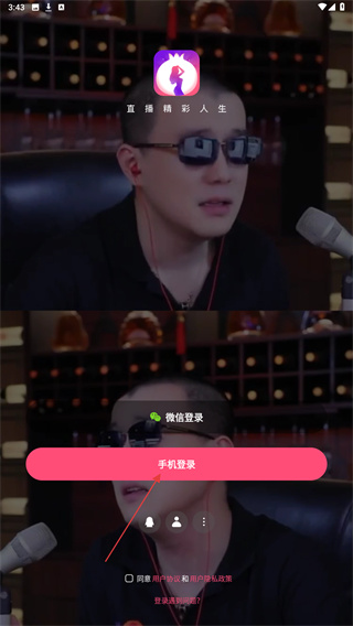 1、打开石榴直播app,进入时点击手机登录的按钮。