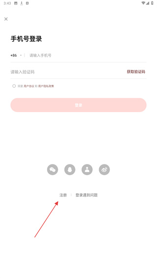 2、进入手机号登录的页面内,点击下方注册的按钮。