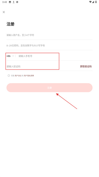 3、输入手机号、验证码后,再点击注册按钮即可完成。