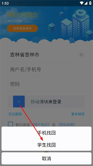 2、在弹出的选项中选择学生找回,进入找回密码页面。