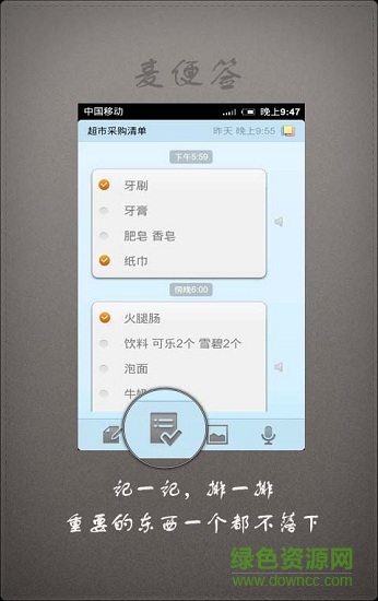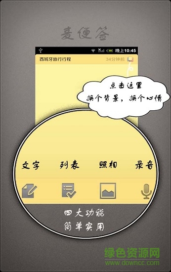 麦便签是Android手机上最好用的便签。麦便签设计简约、漂亮美观并且功能强大。简单一点就能添加文字便签、列表便签、照相便签和语音便签方便好用。各类便签按主题混排浏览,不同便签分文件夹管理,分类清晰,个性十足混。独有的文字和列表便签朗读功能,在你疲于阅读的时候自动帮你读出来。麦便签是您生活不可或缺的好帮手。