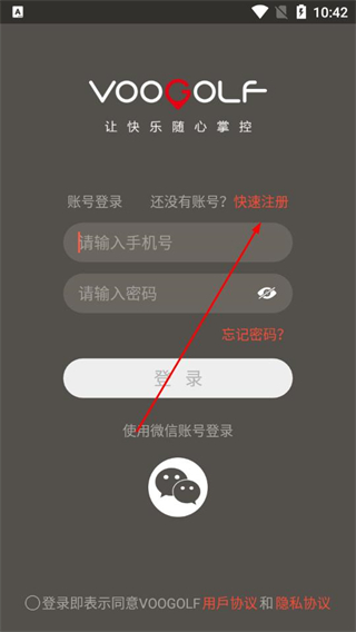 1、在VOOGOLF的登录页面,点击快速注册选项,进入注册页面。
