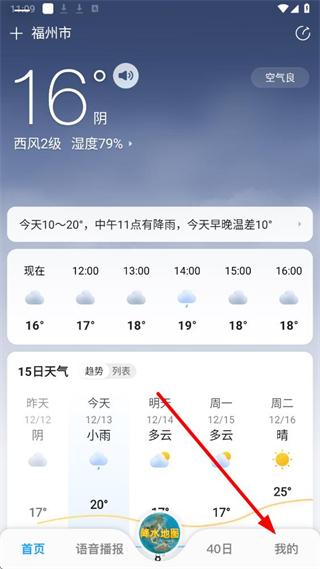 1、打开15日天气预报app,点击底部导航栏最右侧我的选项,进入个人相关界面。