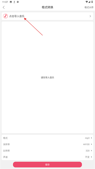 3、进入格式转换的专属操作界面,点击导入音乐按钮。