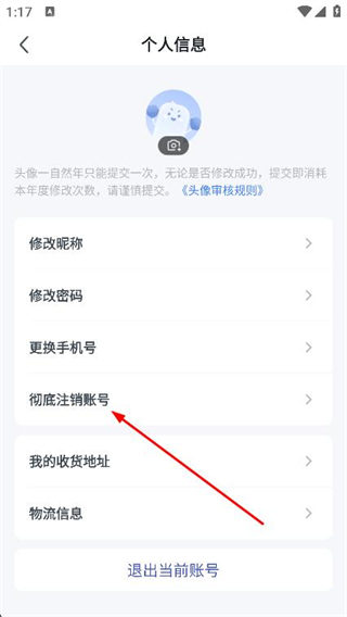3、在个人信息页面找到彻底注销账号并点击,进入注销选择页面。