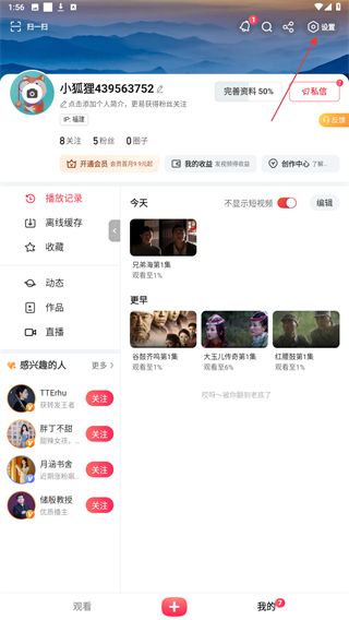 2、在我的页面右上角,点击设置图标,进入设置页面。