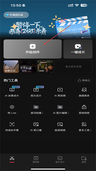 1、打开剪映app,选择一个自己要制作的视频,点击开始创作,在app下方点击一键成片、图片成文。