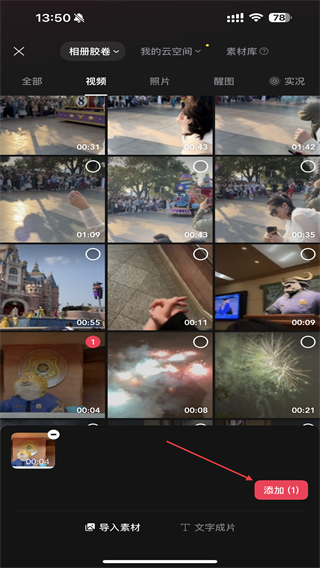 2、在相册中选中目标视频,点击右下角添加,进入视频编辑页面。
