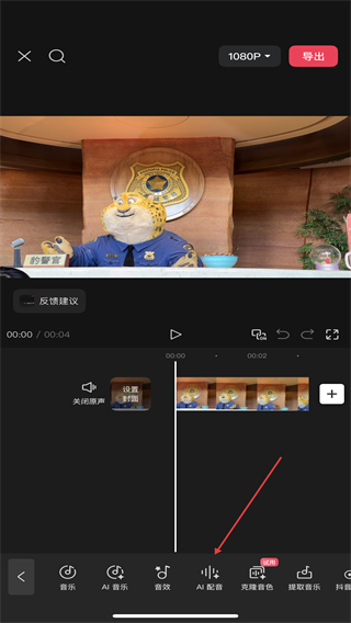 4、在音频菜单里,找到AI配音选项并点击,即可生成配音。