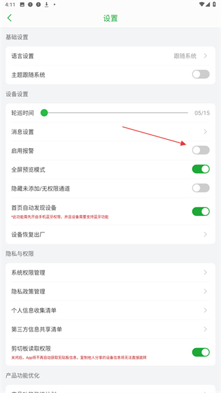 3、在设置的页面内,找到启用报警并开启右侧按钮。