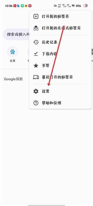 2、在弹出的功能菜单中找到设置选项并点击,进入浏览器的设置操作界面。