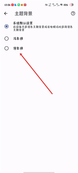 4、在主题背景页面的选项中找到深色调,点击对应的单选按钮即可切换为深色调模式。
