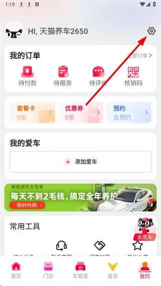 1、在天猫养车app我的页面点击右上角的设置图标,进入设置页面。
