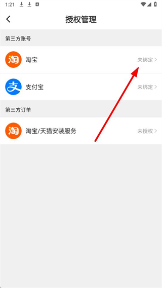 4、在授权管理页面,找到淘宝选项并点击,按照提示完成淘宝账号的绑定操作。