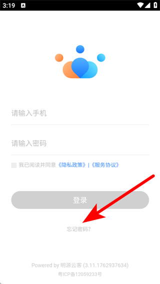 1、打开云行销,在登录页点击忘记密码,进入账号密码找回页面。