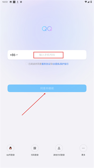 3、在登录的页面内,输入手机号点击同意并继续的按钮。