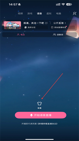 2、在语音直播页面中,点击下方背景的按钮,进入背景管理界面。