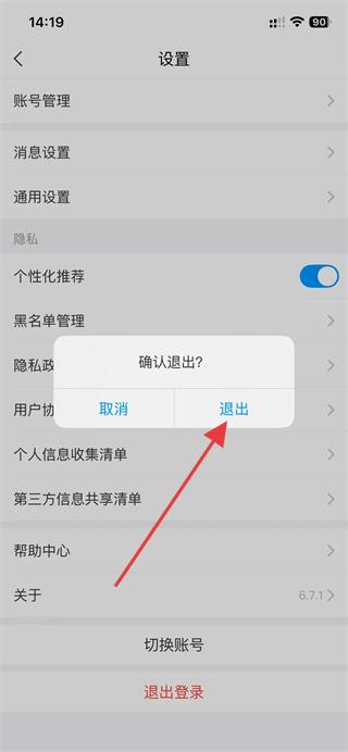 4、在弹出确认框中,点击退出按钮,即可退出登录。