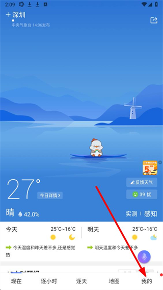 1、在中国天气app天气页面点击我的选项,进入个人页面。