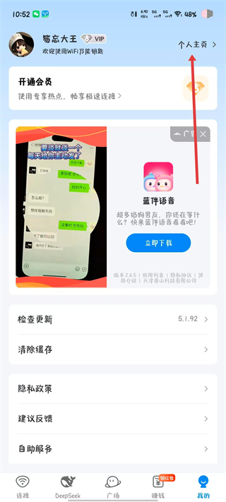 1、打开WiFi万能钥匙进入我的页面,找到右上角个人主页选项并点击。