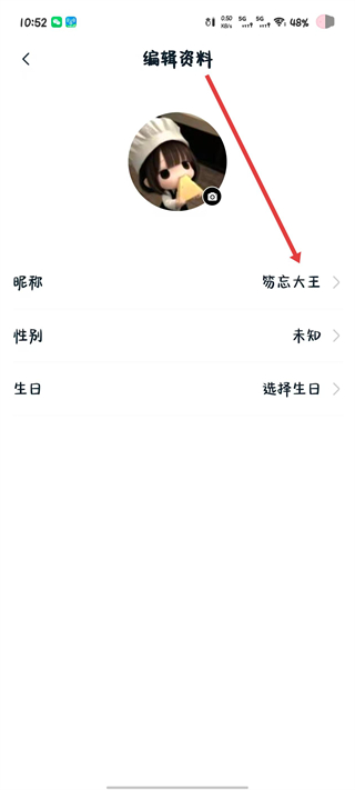 3、在编辑资料页面里,找到昵称选项,点击当前显示的昵称进入编辑名字界面。