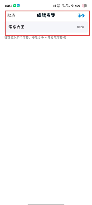 4、在编辑名字界面输入新昵称,确认符合字符要求后,点击右上角保存按钮。