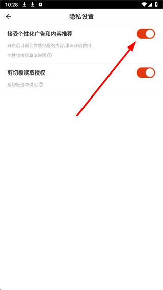 4、在隐私设置页面,找到个性化广告对应的开关,点击将其关闭即可停止个性化广告推送。