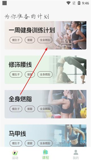 2、在课程页面中,选择目标计划,该计划包含瘦肚子、瘦腿等训练方向。