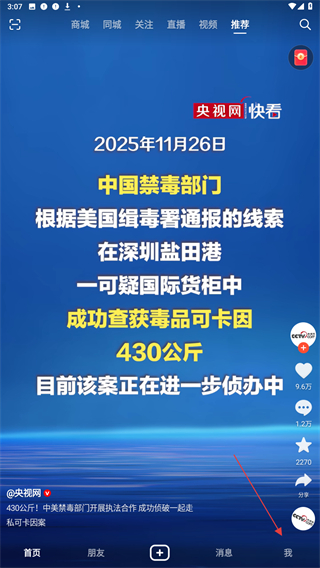 1、在抖音视频播放的页面,点击右侧的分享的箭头。